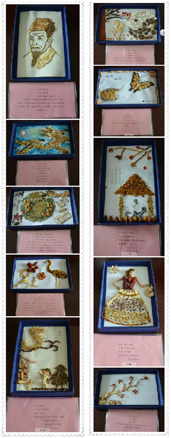 王晓冰、张懿冰制作的《李时珍》用麻黄汤重组成了李时珍的肖像,表达方药之间不可分离之意,同时表达作品创作者对医药先贤的敬意。麻黄汤中麻黄为该方的君药,所以作品以麻黄为主。作品深远的立意及精美的制作打动了所有评委,获得最高评分。二等奖作品中《地球,可持续发展》紧密围绕5.18国际博物馆日的主题进行创作。今年5·18国际博物馆日的主题是"博物馆致力于社会的可持续发展",作品表现的是为了让地球这个硕大而又贫瘠的"储物罐"造福千万代,需要我们每个人用手为它存一片绿叶,让植物资源无穷无尽。而《蛟龙出海》用小青龙汤勾勒出蛟龙出海的场景,富有创意,并赋诗曰:"小青龙汤铸蛟龙,蛟龙出海展药色。中医发展待英才,共园腾飞中国梦。"其他获奖作品也各有特色,展现出中医学子们对中医的深深热爱之情。