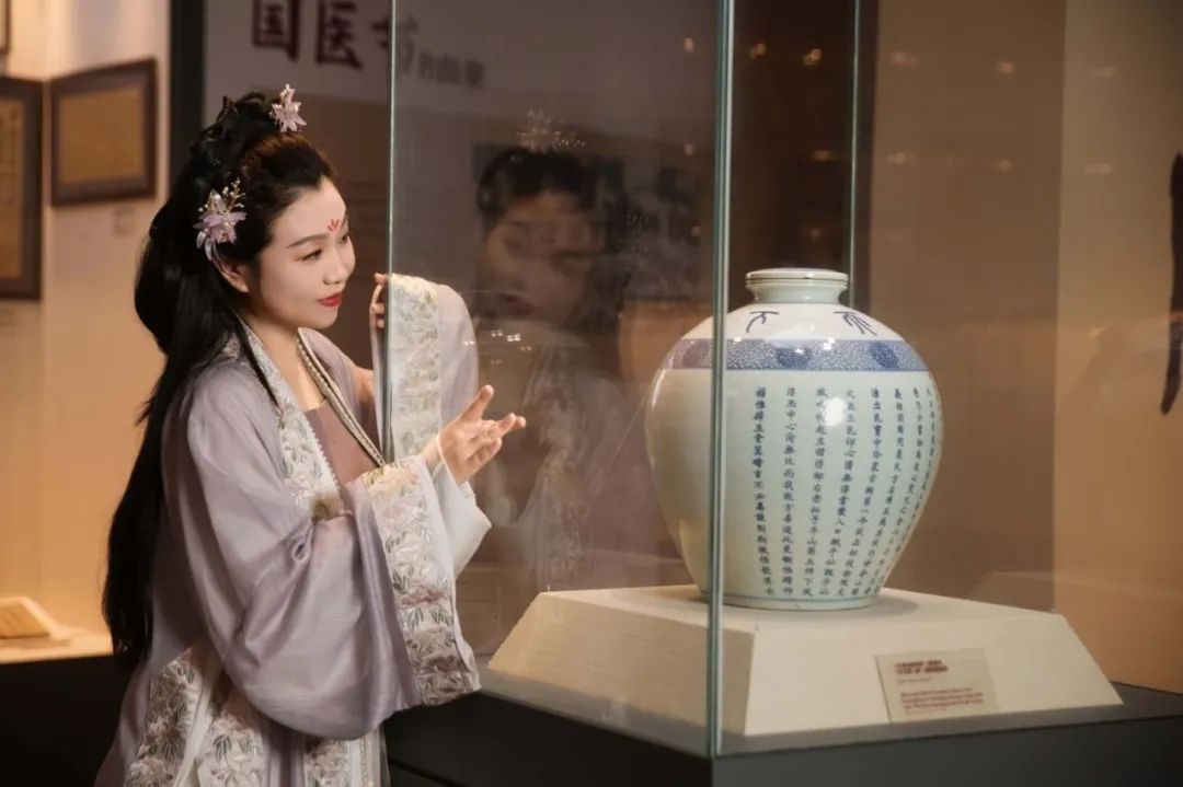 医史馆内,光绪年制"天下第一泉"青花瓷罐见证着那“回眸一笑百媚生”的千年风韵。老师们云鬓轻挽,执扇回眸间,与罐身乾隆御笔诗文遥相唱和,演绎着"清水养人,汉服养心"的中式美学。