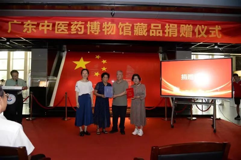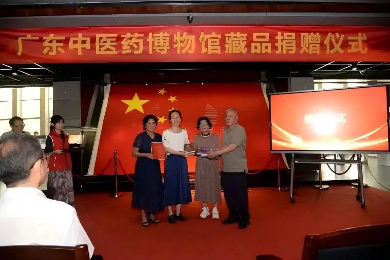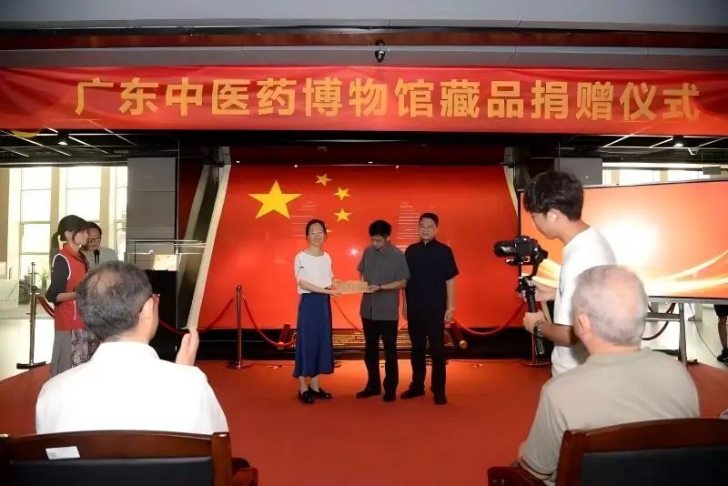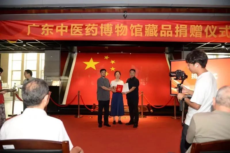 杨蔚副馆长代表广东中医药博物馆接受捐赠,并向捐赠者颁发证书和赠送书籍。